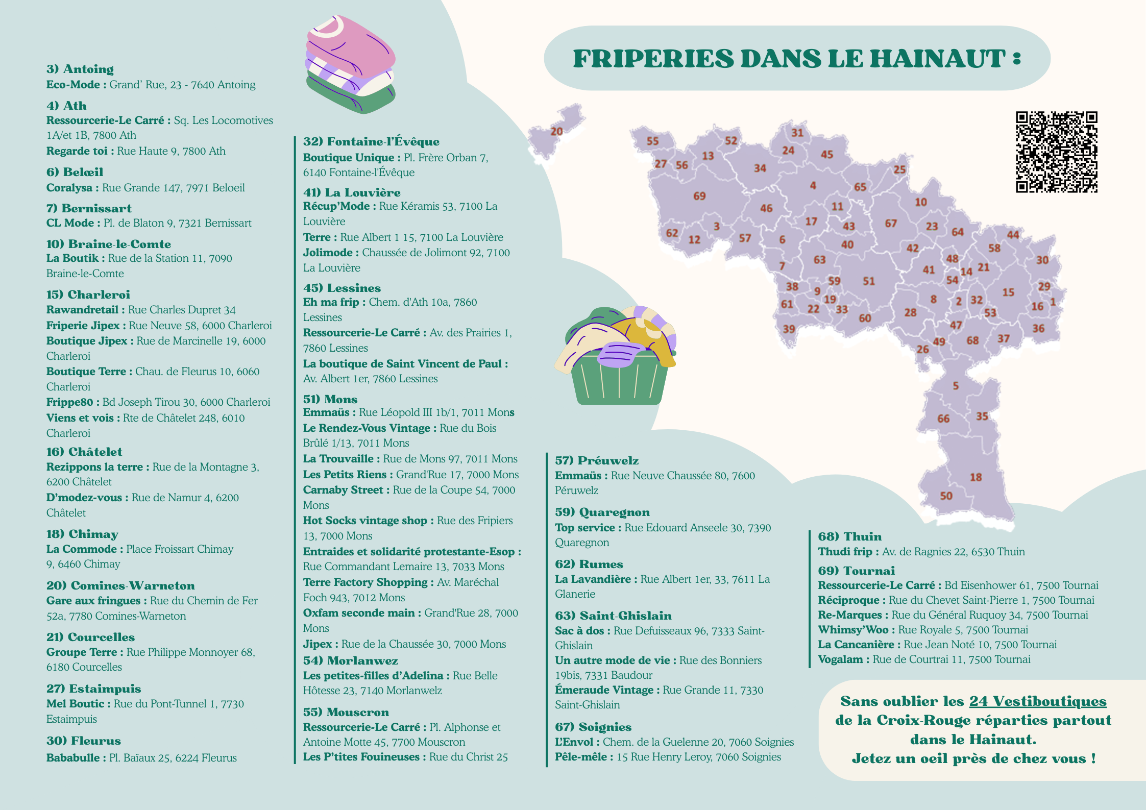Nous avons également créé une carte répertoriant toutes les friperies actives dans le Hainaut en mai 2025. Avec pas moins de 73 friperies pour 69 communes, ouvrez l’œil, vous en avez sûrement une près de chez vous ! Vous pouvez télécharger la carte disponible ci-dessous.